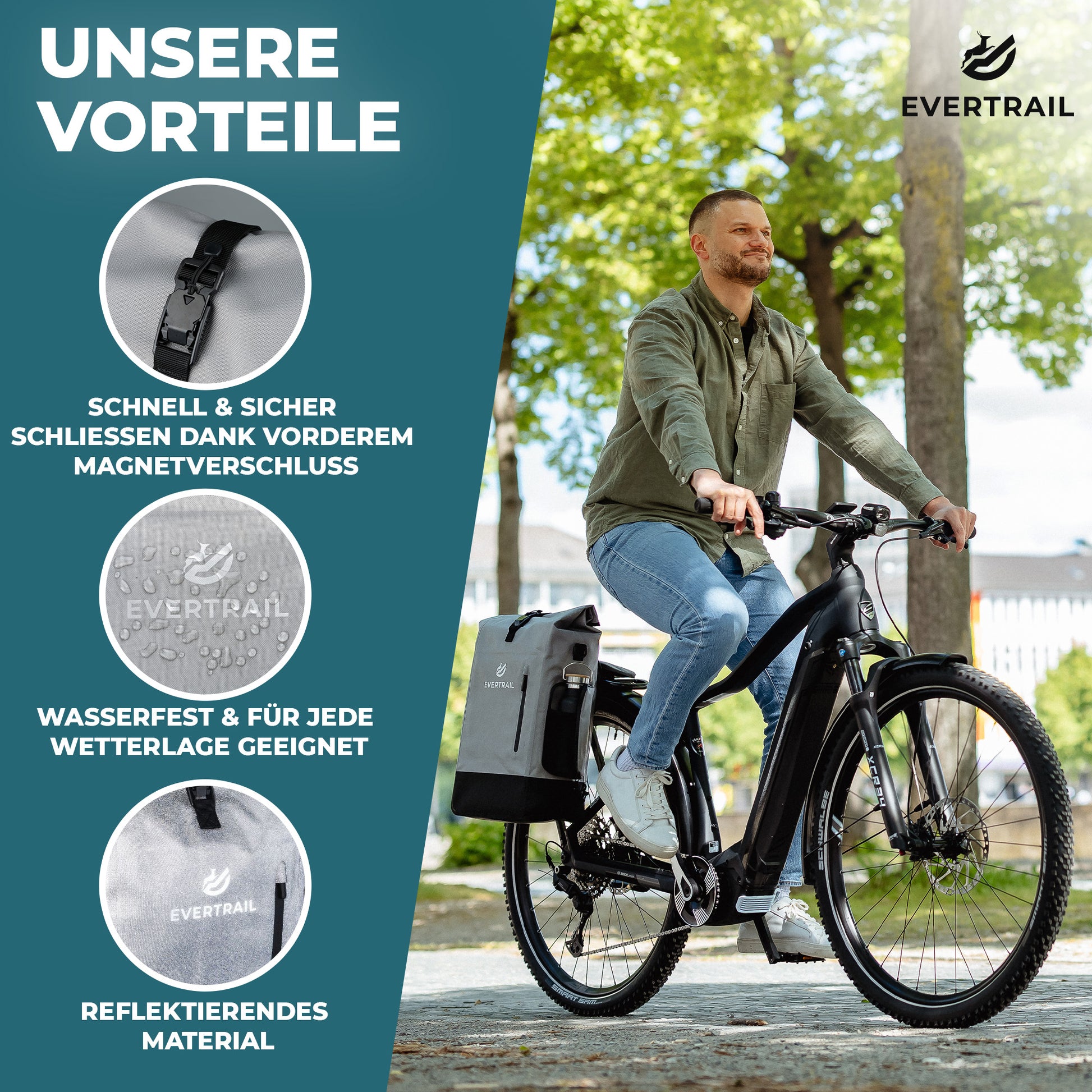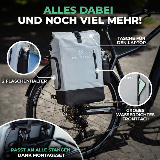 Die Evertrail Original ist unsere wetterfeste Gepäckträgertasche mit überraschend viel Stauraum. Trotz schlanker Form bietet sie bis zu 28 Liter Volumen, ein herausnehmbares Laptopfach und cleveres Design. Die stabile Haube schützt zuverlässig, während du sie wahlweise am Rad oder mit dem Schultergurt tragen kannst.