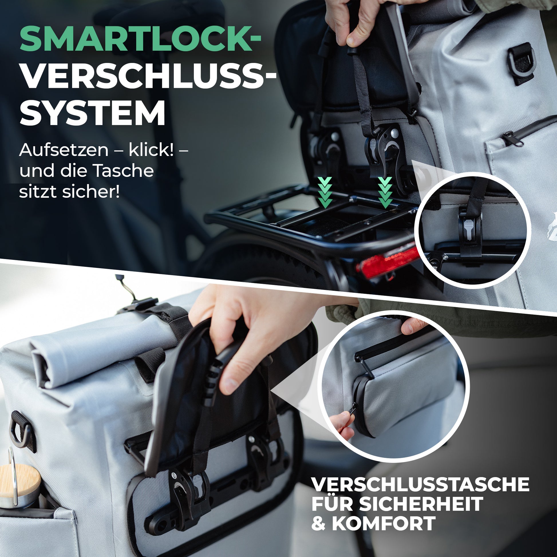 SMARTLOCK-System: Einfaches Einrasten auf dem Gepäckträger – kein Werkzeug, kein Fummeln.